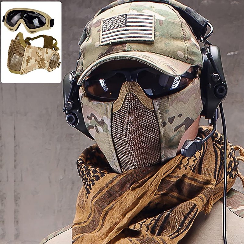 AOUTACC Airsoft Protective Gear Set, Half Face Mesh Mask with Ear Protection and Tactical Goggles for Adult Men Women BBS Paintball Shooting CS Survival Games Cosplay (DD)
