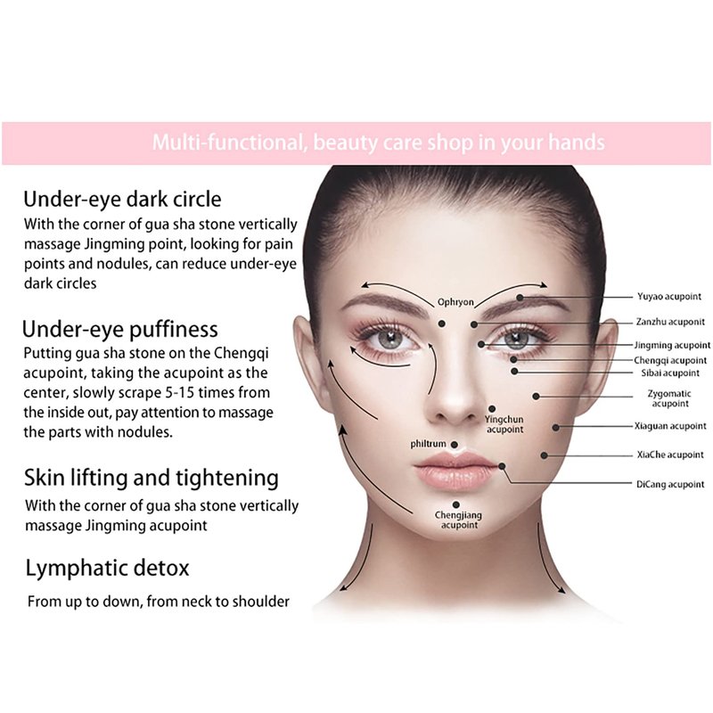 - ☞Efficacy:a facial skin massager roller for face, body, eyes, neck will cool, tighten, relax.We recommend that you clean the Jade Roller Gua Sha Facial Tools Set before each use.