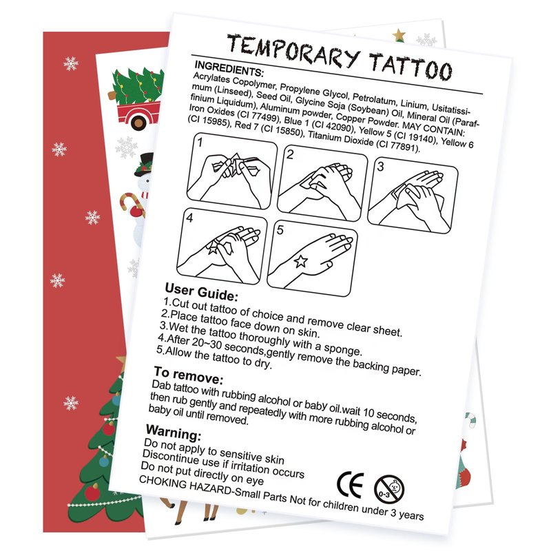 - The Perfect Party Accessory: The temporary tattoos are perfect for Christmas party decorations or accessories, party supplies, party favors, DIY decorations and so on. Recommend to apply them to your body and face to take part in the Christmas party. Can increase the festive atmosphere! Each sheet measures 8.25 " x 6 " creating the perfect size tattoos!