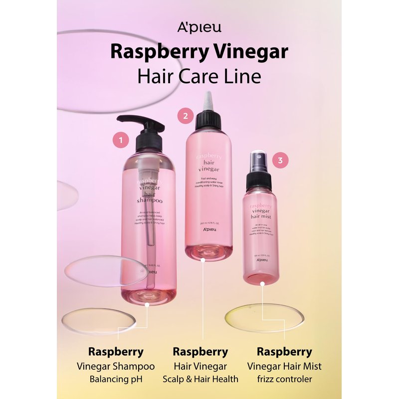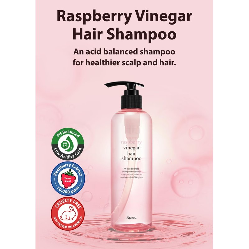 A'PIEU is all about effortless beauty and simple self care; the Hair Vinegar series was created to strengthen and enhance your hair. Introducing the Raspberry Vinegar Hair Shampoo by A'PIEU – a perfect fusion of simplicity and effectiveness for radiant beauty. With its water-like texture, it nurtures each strand, providing a shield against damage and impurities. The vinegar's acidity restores optimal pH levels, eliminating buildups and safeguarding the hair cuticle for visibly shinier, tangle-free hair. Elevate your haircare routine with the transformative results of Raspberry Vinegar Hair Shampoo.