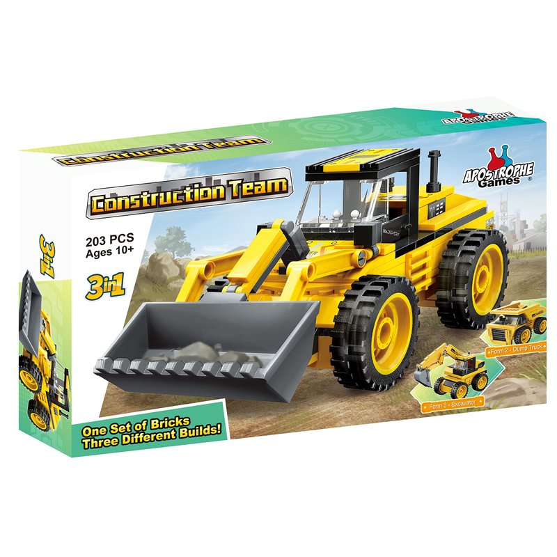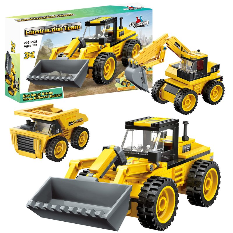 Apostrophe Games 3 in 1 Construction Team Building Block Set (203 Pieces) Build a Loader, Dump Truck or Excavator, for Kids and Adults