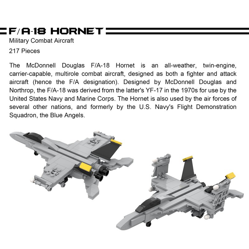 - Each vehicle has movable parts!: F/A-18 Hornet combat aircraft, F-14 Tomcat fighter jet, AH-64 Apache Helicopter, M2 Bradley tank, and Humvee Avenger air defense system