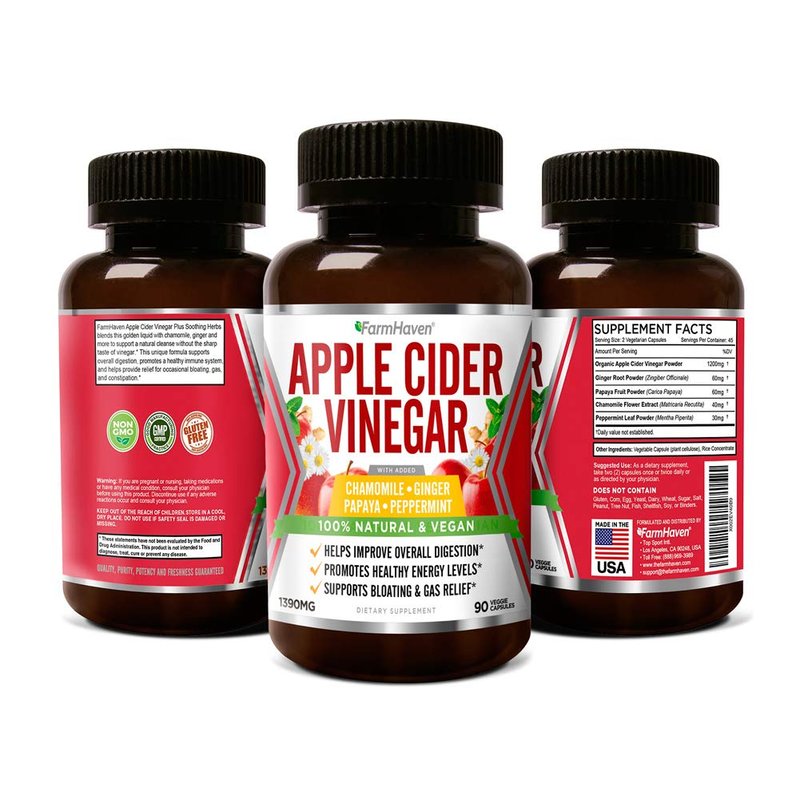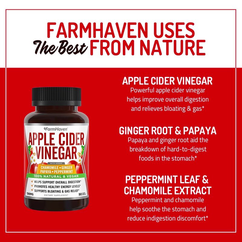 - REAL APPLE CIDER VINEGAR WITH SOOTHING HERBS: Get more from your ACV capsules with FarmHaven Apple Cider Vinegar Plus Soothing Herbs! We blend 1200mg of pure apple cider vinegar with chamomile extract, ginger root, and more. Each vegan and non-GMO pill delivers the incredible immune and digestion boosting benefits of this golden liquid.*