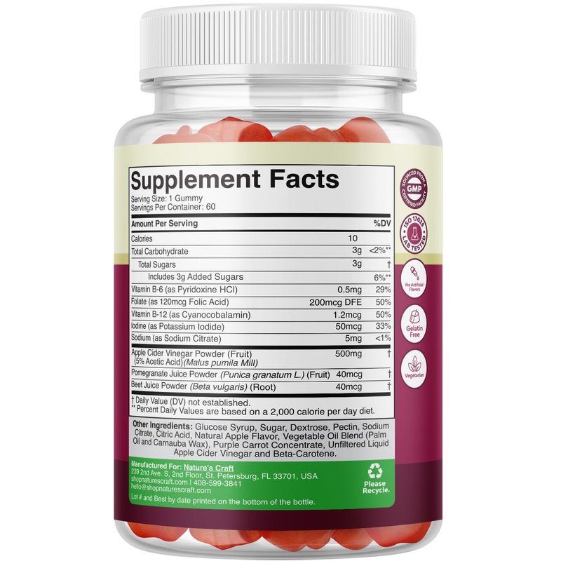 - Formulated in the US - Here at Natures Craft we have your needs in mind that is why our gummy vitamin ACV supplements are gluten free non-GMO formulated by GMP labs and 3rd party tested for potency