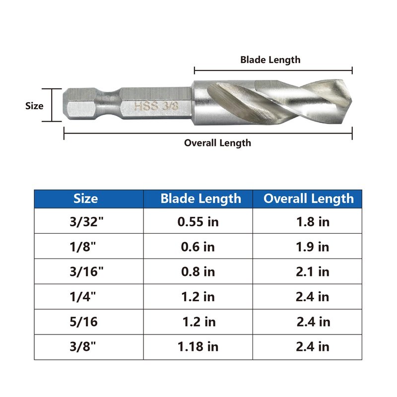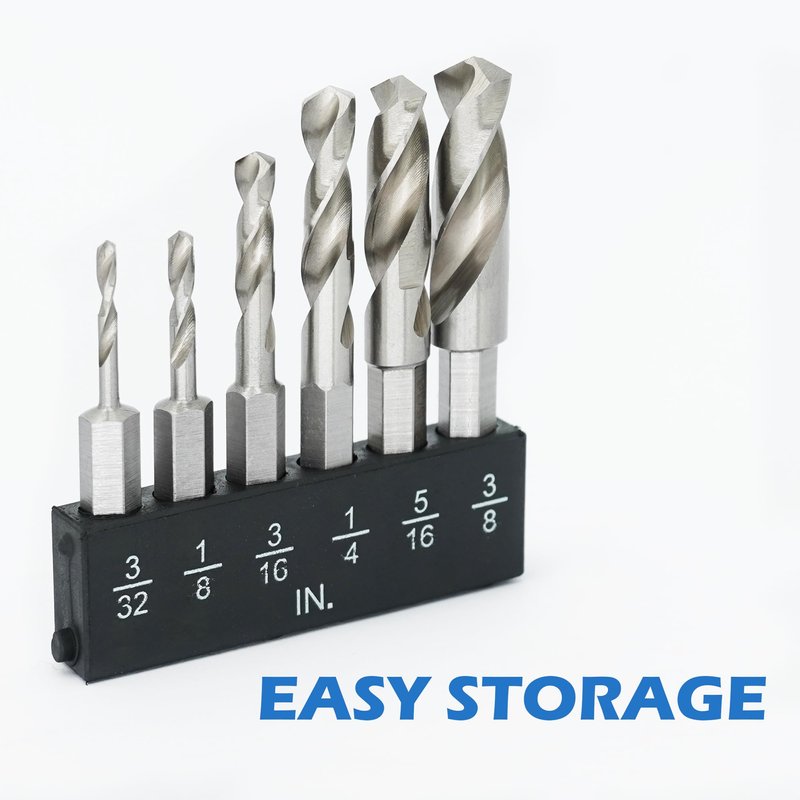 - WIDE APPLICATIONS - The drill bit set includes 6 different sizes of drill bits: 3/32", 1/8", 3/16", 1/4", 5/16",3/8". The drill set is suitable for working with plastics, wood and soft metals such as aluminium and sheet metal, but not for thicker metals.