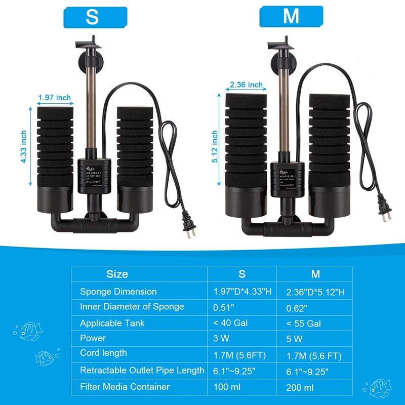 - 【S/L Filter Dimensions】Small filter is 6" in width and 11" in height, sponge dimension is 1.97" in width and 4.33" in height, the sponge inside circle diameter is 0.51 inch, suggest for 10 to 40 gallons fish tank. Large filter is 6.3" in width and 11" in height, sponge dimension is 2.36" in width and 5.12" in height, the sponge inside circle diameter is 0.62 inch, suggest for 15 to 55 gallons fish tank. NOTE: L as a “clerical error”