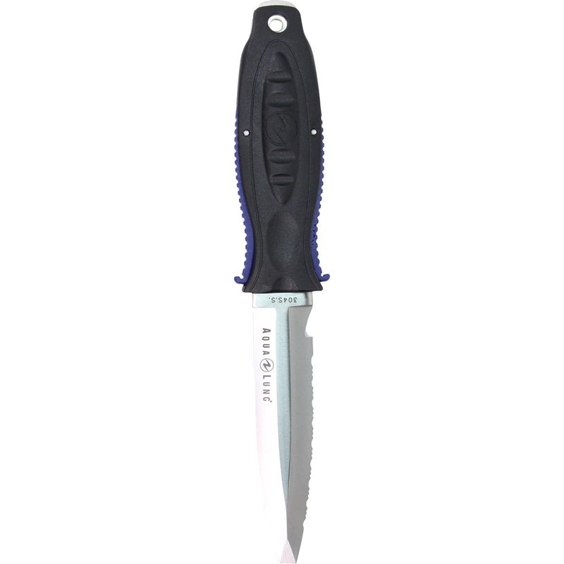 The Aqualung Big Squeeze Sheepsfoot Knife is a heavy-duty, no-nonsense knife that's designed specifically for scuba diving. The innovative squeeze lock design holds your knife securely in place while also providing rapid access with a simple handle squeeze. The 4.5" sheepsfoot blade is great for hammering and pounding and allows you to perform quick, controlled cuts without worrying about puncturing or stabbing anything. Plus, it comes with a line cutter and partially serrated bottom for cutting rope or netting. Easy-to-use squeeze lock design with sheath 4.5" sheepsfoot blade with line cutter and partially serrated bottom Durable nylon and fiberglass handle provides a secure grip Various mounting options (leg strap channels, built-in BC connection points, 2” locking clip) Rugged 304 stainless steel construction Measures 9.5"L overall