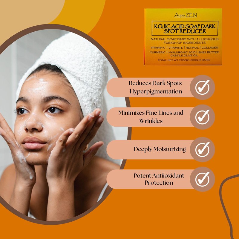 - (Advanced Skin Brightening) Harnessing the power of Kojic Acid Soap, this soap effectively reduces the appearance of dark spots, hyperpigmentation, scars, and uneven skin tone, promoting a brighter complexion.