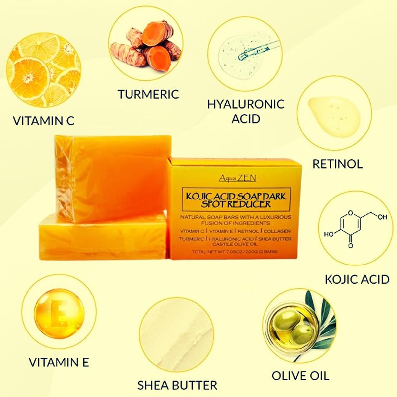 Aqua ZEN Kojic Acid Soap Dark Spot Remover with Turmeric, Vitamin C+E, Retinol, Collagen - (2) Bars X 3.5OZ EA+Soap Net - Premium Compound Infused w/Hyaluronic Acid, Shea Butter, Castile Olive Oil