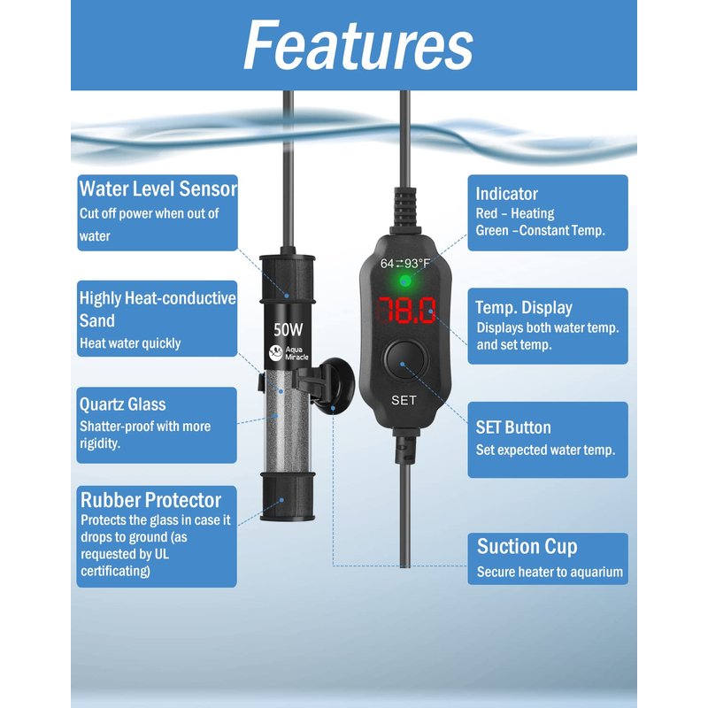 AquaMiracle Adjustable 50W Aquarium Heater Submersible Fish Tank Heater Super Short Aquarium Heater with LED Digital Display Thermostat, for Tanks 5-10 Gallons