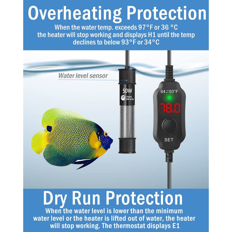 - DRY RUN / OVERHEATING PROTECTION – Full consideration of safety. With the multiple protections this fish tank heater will stop working when the water level is lower than the minimum water level (DRY RUN PROTECTION) or when the water temperature exceeds 97F (OVERHEATING PROTECTION). You are free from “cooking fish”!