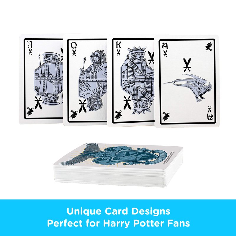 - BEAUTIFUL CARD DESIGNS: This magical deck of playing cards includes 54 cards that feature designs from the Ravenclaw House and its crest. Their daring, nerve and chivalry set Gryffindors apart.