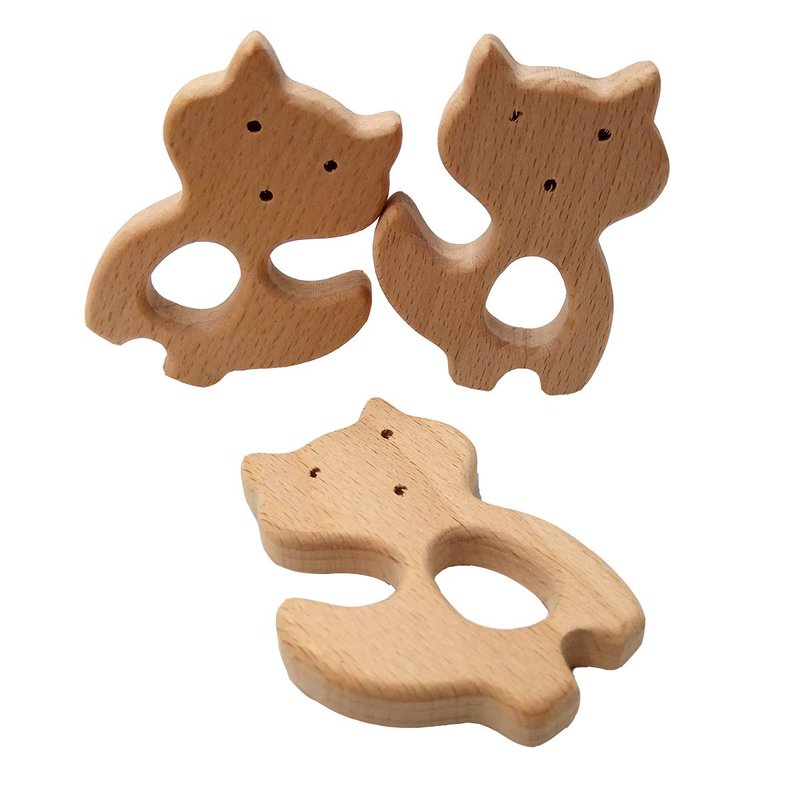 Arakierst 10pcs Organic Wood Fox Teether Pure Natural Animal Shape Beech Wooden Handmade Grasping Pattern DIY Pacifier Chain Pendant