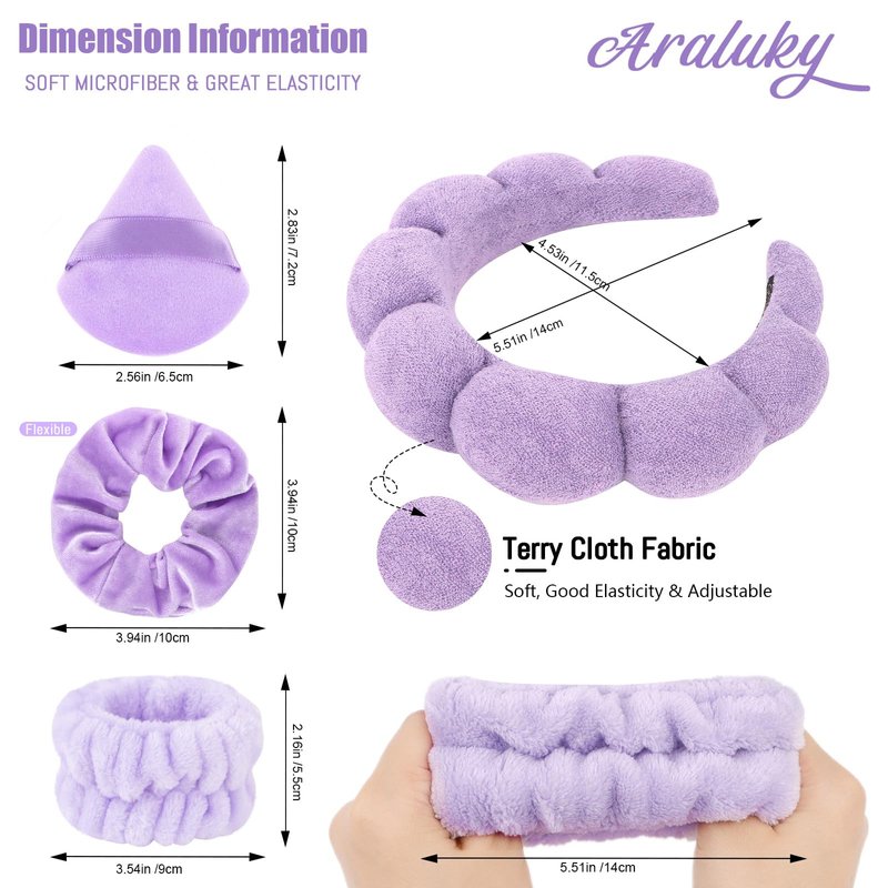 Araluky 7Pc Puffy Spa Headband and Wristband Set Skincare Headband for Washing Face Scrunchies Powder Puff Sponge Spa Makeup Headband Puffy Headband Terry Cloth Headband for Mask Makeup Removal-Purple