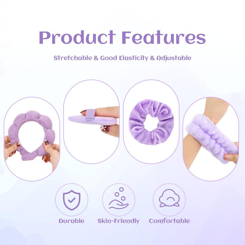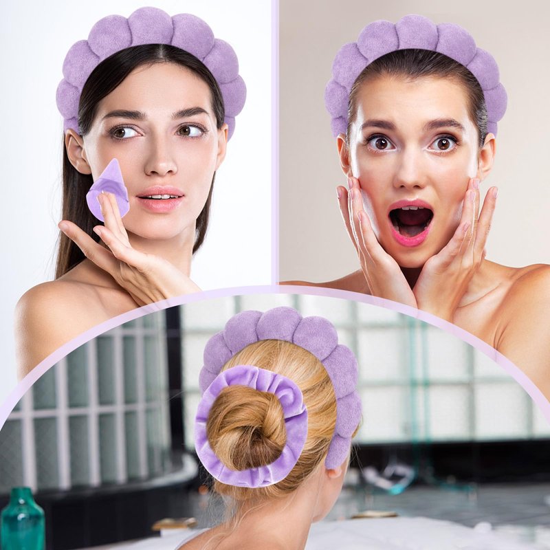 7Pcs Puffy Spa Headband for Washing Face Bubble Skincare Headbands with Wristbands Scrunchies Powder Puffs Sponge Spa Makeup Headband Puffy Headband Terry Cloth Headband for Mask Makeup Removal-Purple