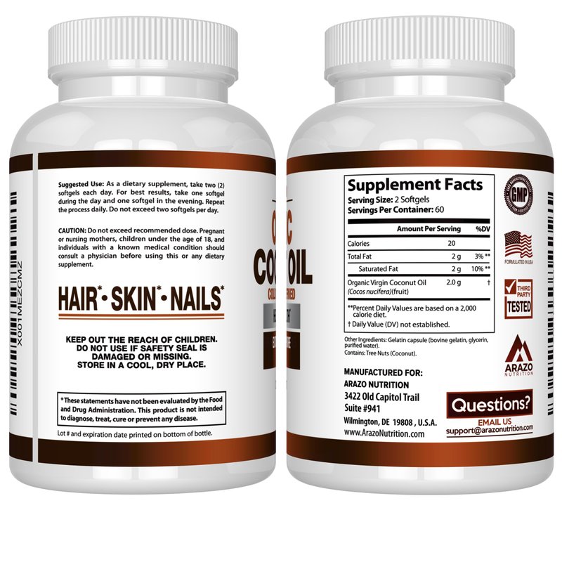 Arazo Nutrition Organic Coconut Oil 2000 MG - 100% Extra Virgin Unrefined Cold Pressed for Weight Support, Skin, Hair, Nails - 120 Softgel Capsules