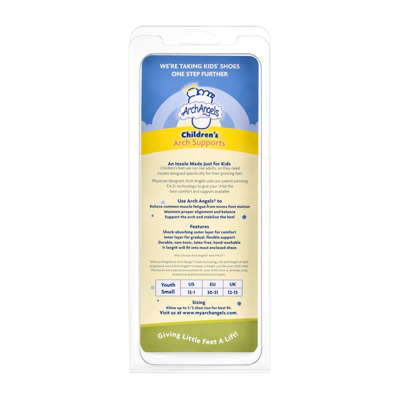 Arch Angel Comfort Insoles by ArchAngels pick up where the shoe design leaves off - by upgrading the insole. Arch Angels can do what even the best shoes can't: makes kids' feet more comfortable while enhancing natural arch development. Arch Angels were designed by two foot doctors with over 25 combined years of experience in practice who identified a previously unmet need: How to support the needs of a growing child's feet, with a product that can be used in any enclosed shoe, can stand up to the demands of active kids, and is affordable. Arch Angels uses a unique triple-layer design: -cushioning foam top layer -supportive inner core -durable, kid-friendly foam bottom Arch Angels are constructed of durable, non-toxic materials, and are hand washable. Arch Angels contour to the developing foot, going from a low, gentle curve in the smallest size, to a higher arch that more resembles an adult foot with the largest size. Simply put, no matter what you pay for your children's shoes, any shoe with Arch Angels inside is a better shoe! Arch Angels will fit into any enclosed shoe and can be moved from shoe to shoe to provide uninterrupted support. Product photo may not exactly match the product offered for sale. Made in the U.S.A. Please refer to the product description.