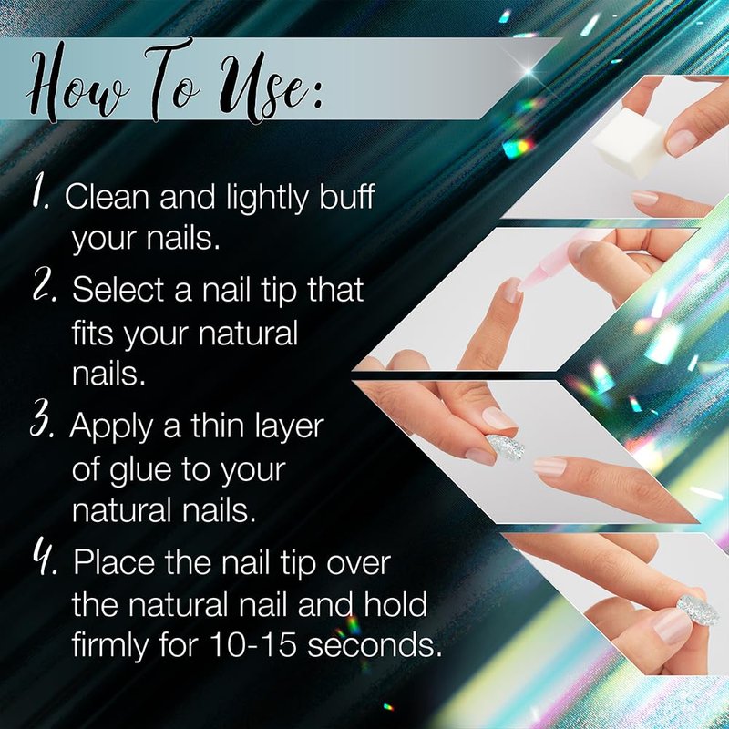 - Complete Artificial Nail Set: Includes 24 Holographic Glitter medium-length nails, 1 professional nail glue, 1 mini nail file, and 1 cuticle stick; all-in-one nail system perfect for false nails beginners or who prefer getting nails done at home; no need to buy separate nail essentials