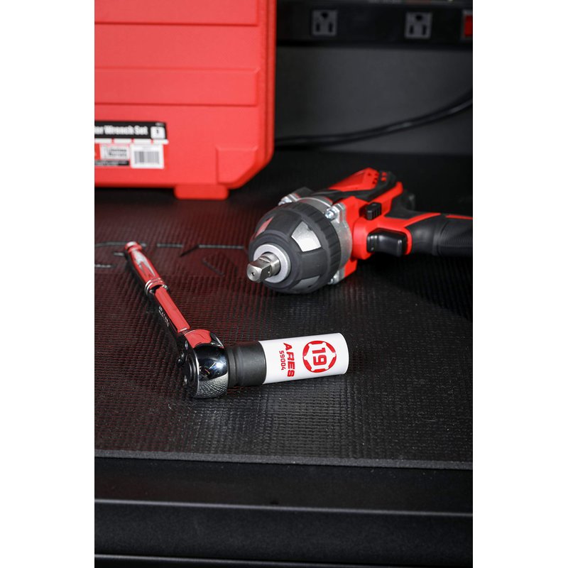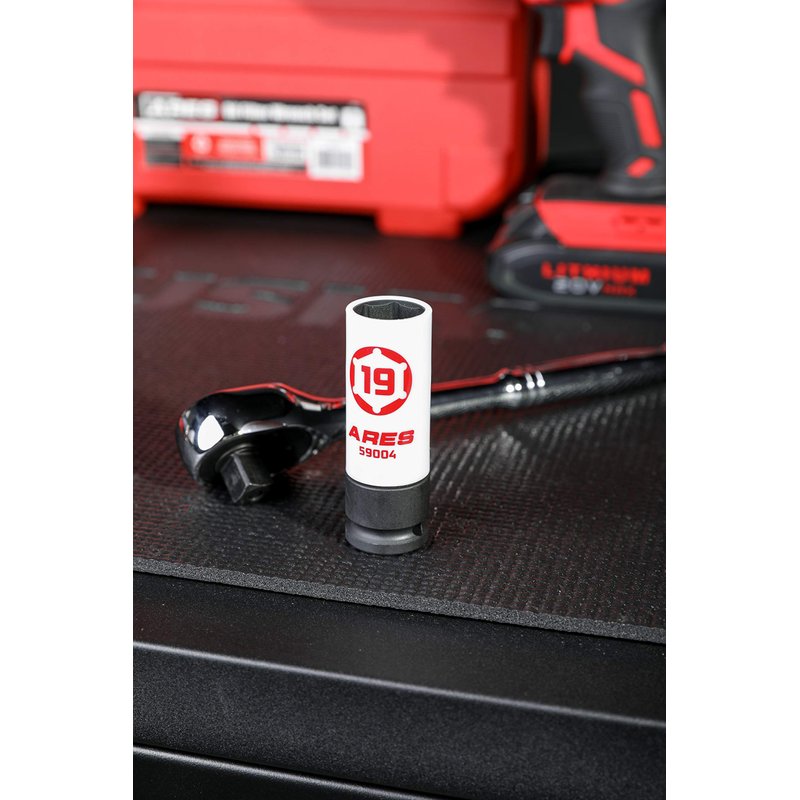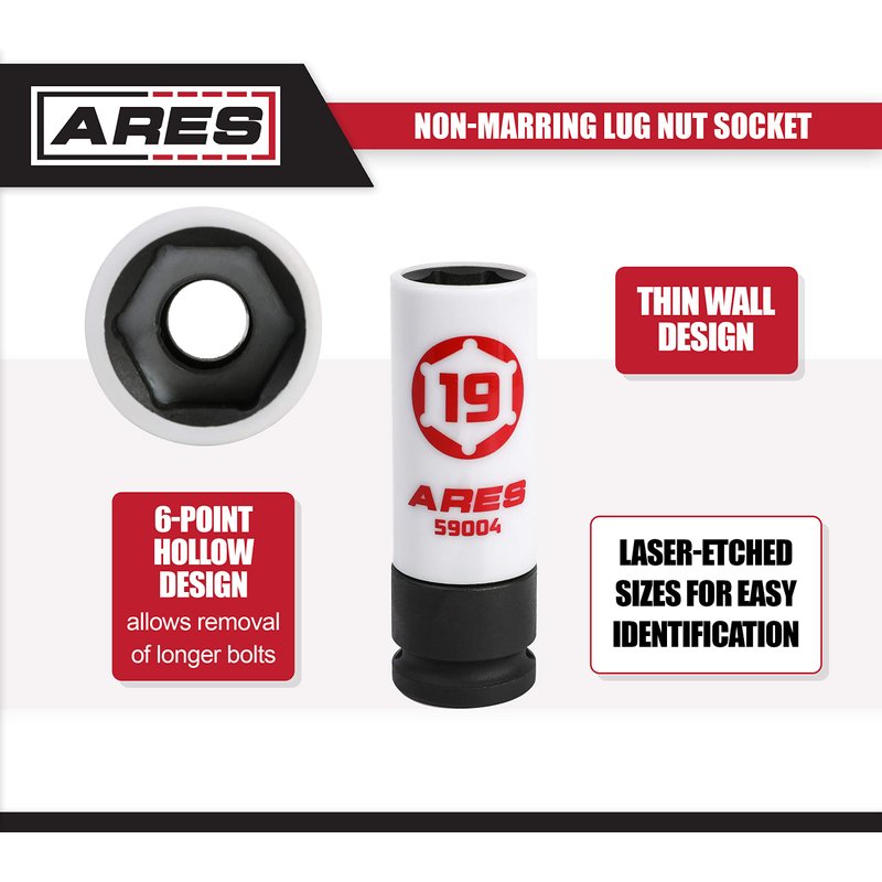 Protect Your Rims The ARES 19 mm Non-Marring Lug Nut Socket will remove bolts while preventing damage to your aluminum or custom rims, thanks to its protective vinyl jacket. The hollow design allows room for removing longer bolts, and the non-marring insert will protect your lugs. Made with chrome molybdenum, it's strong enough to use with an impact wrench without worrying about damaging your new car or aftermarket rims. Protecting your big investment with the right tool makes sense. Features: Includes: 1 pc. 19 mm non-marring lug nut socket 1/2 in. drive Overall length is 85mm, or roughly 3 3/8 in. Outer diameter is 1.15 in. Protective vinyl jacket prevents damage to aluminum or custom rims Hollow design allows removal of longer bolts Non-marring insert protects lugs Constructed of chrome molybdenum Please Note: Some wheels have very confined lug wells and the outer nylon sleeve may be prohibitive in accessing the lug