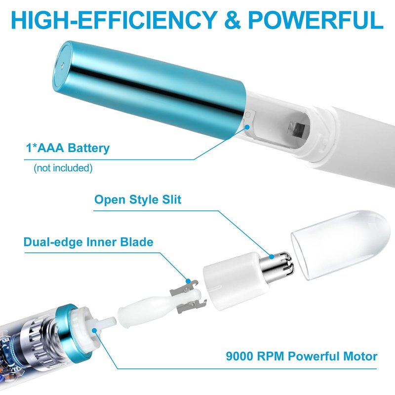 - đăPOWERFUL AND FASTERă: This nose hair trimmer features high quality 6500RPM powerful motor and dual-dual-edge blade, 50% more powerful than others, which precisely remove the hairs quickly without painful and unpleasant pulling.