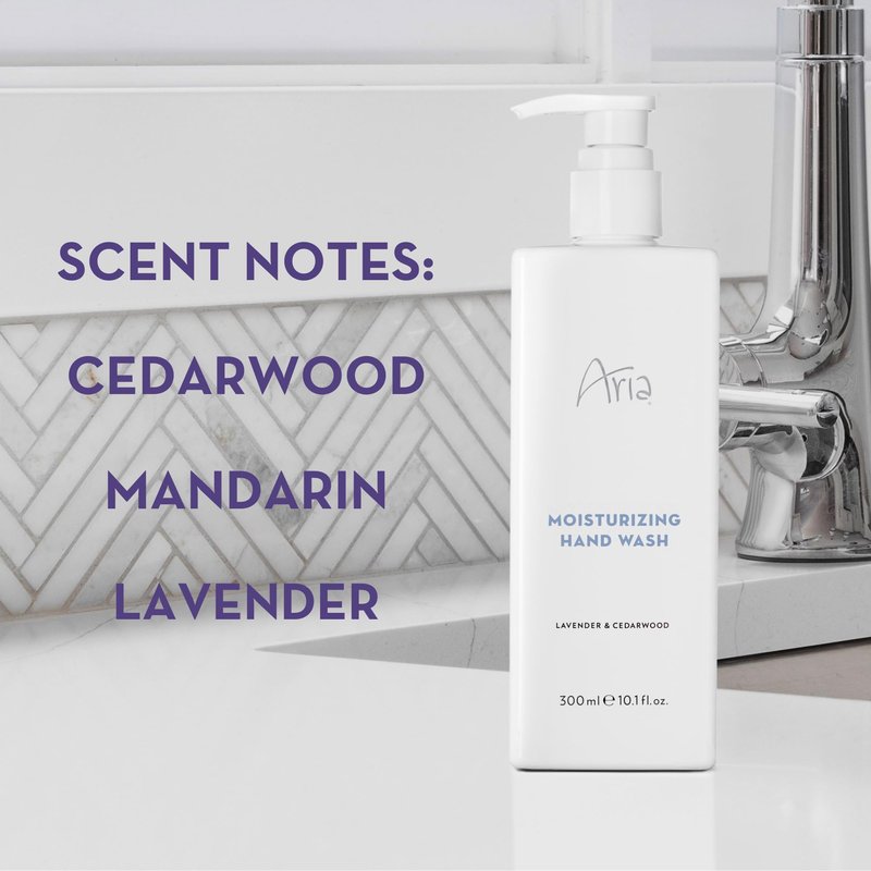 - Moisturizing Hand Wash - Elevate the ambiance of your bathroom with the sophisticated allure of our Hand Wash from Aria. Luxuriate in its creamy lather, which not only cleanses but also nourishes your skin with the soothing essence of lavender and cedarwood. Infused with a delicate fragrance of green mandarin, this hand wash leaves behind a subtle, citrus-infused aura, adding a touch of elegance to your everyday routine.