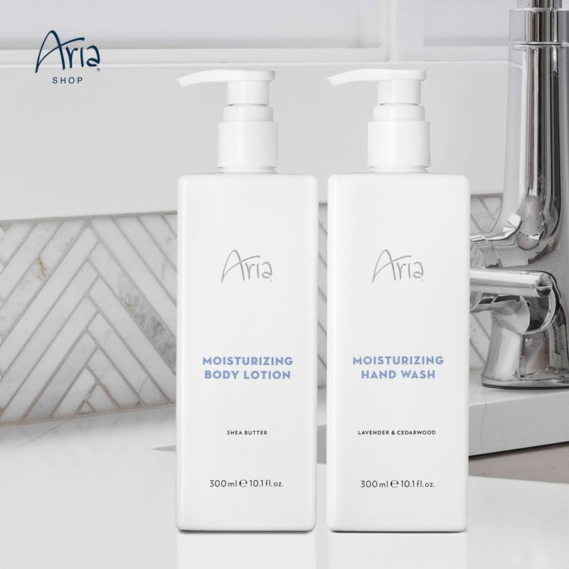 - Hand Wash & Body Lotion - Experience the everyday opulence of the ARIA Sink Set, a luxurious addition to your daily routine. Immerse yourself in its invigorating fragrance and nurturing blend of lavender, cedarwood, and shea butter, as they work together to transform your ordinary moments into pure indulgence and sensory delight.