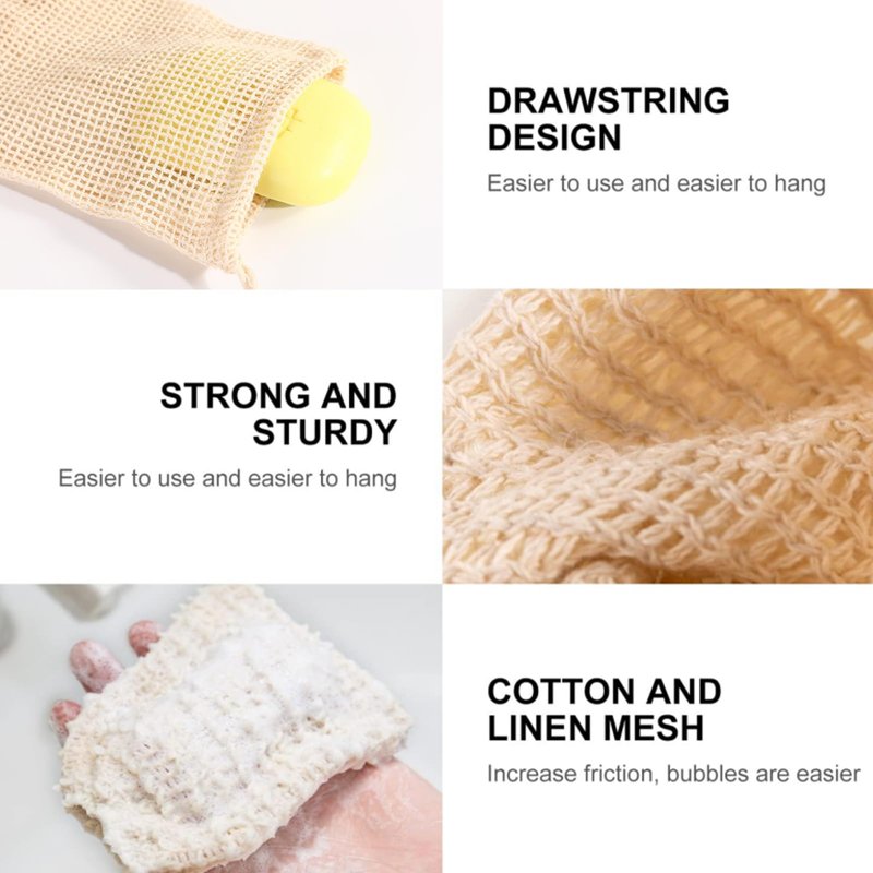 Features< br > Material: Natural cotton and linen. < br > Dimensions: 14.5 x 9.5cm / 5.7 x 3.7 inches. < br > Package includes: 20 packs of natural cotton and linen soap bags in total. < br > Produces rich and fine foam to gently remove oil and dirt from skin. < br > Drawstring design, can be dried after use, clean and hygienic. < br > Maintain good light friction to remove grease and dirt, stimulate the face, arms and other parts, bringing refreshing and fun to bathing. < br > Warm reminder: < br > When using, soak in warm water for two minutes to make the fabric soft and delicate. < br > Some products may have a bit of vegetable oil smell, please spread it out. < br > Wash after use and dry in a ventilated place or in the sun.
