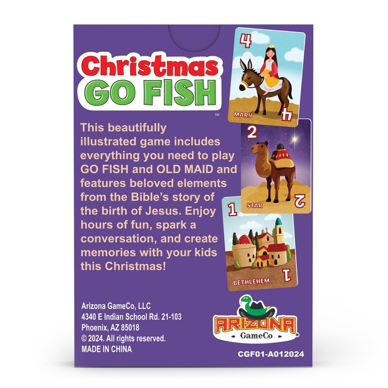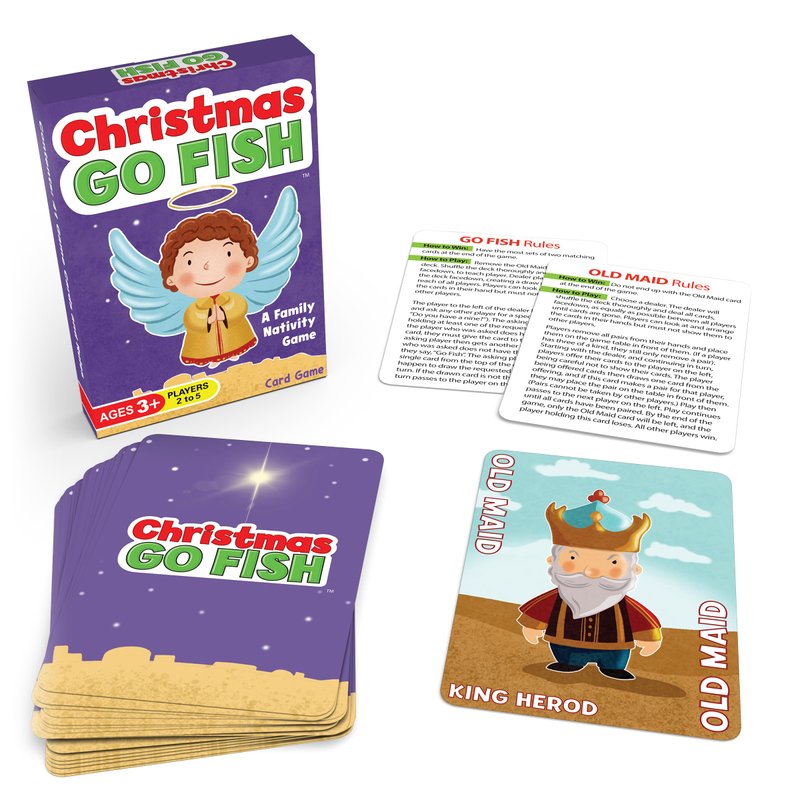 - Christmas Fun: Enjoy a fun, heartwarming twist on classic card games with this adorable version of Go Fish and Old Maid, all in one deck. Featuring iconic images from the nativity story, this game is perfect for family game nights, holiday party, gifts for boys and girls, or stocking stuffers for kids