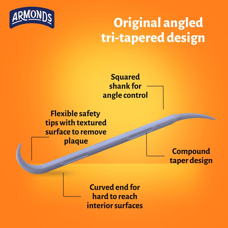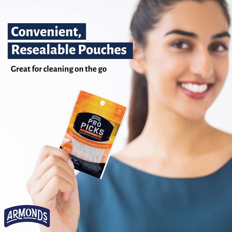 Wow your mouth with our fresh mint flavor while cleaning between teeth and massaging gums with our convenient, easy to use Armonds ProPick Advanced. The firm shank and ergonomically engineered design make gripping and angle control easy. The textured tri-tapered safety tips fit snugly between teeth and gum for better cleaning and plaque removal. These picks come is a resealable pouch perfect for pocket, purse or glove box.