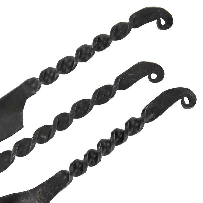 Hand forged from iron and given a blackened antique finish for an authentic look, this cutlery set includes a knife, fork and spoon to give you everything you need for a taste of authentic medieval camp life. The three utensils each feature a twisted design in their grip, adding a fine touch of detail to their design. The knife has a short drop point blade with a curved edge and a fine point, a curled over handle provides a wider grip. The fork features two tines, like the traditional carving fork, and both the fork and the spoon feature straight grips that end in little curled hooks for easy and convenient storage when they are not in use.