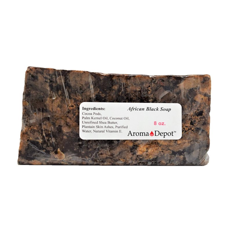 - African Black Soap Ingredients: Black soap made from locally harvested African plants such as plantain, cocoa pods, palm tree leaves, and shea tree bark. The ingredients are sun-dried and roasted, which is how it gets its deep color. Water and oils such as coconut, palm, and shea butter are then is added. These Bars are Handmade, each bar will vary in cut size. 8oz. Bar wrapped in shrink wrap.