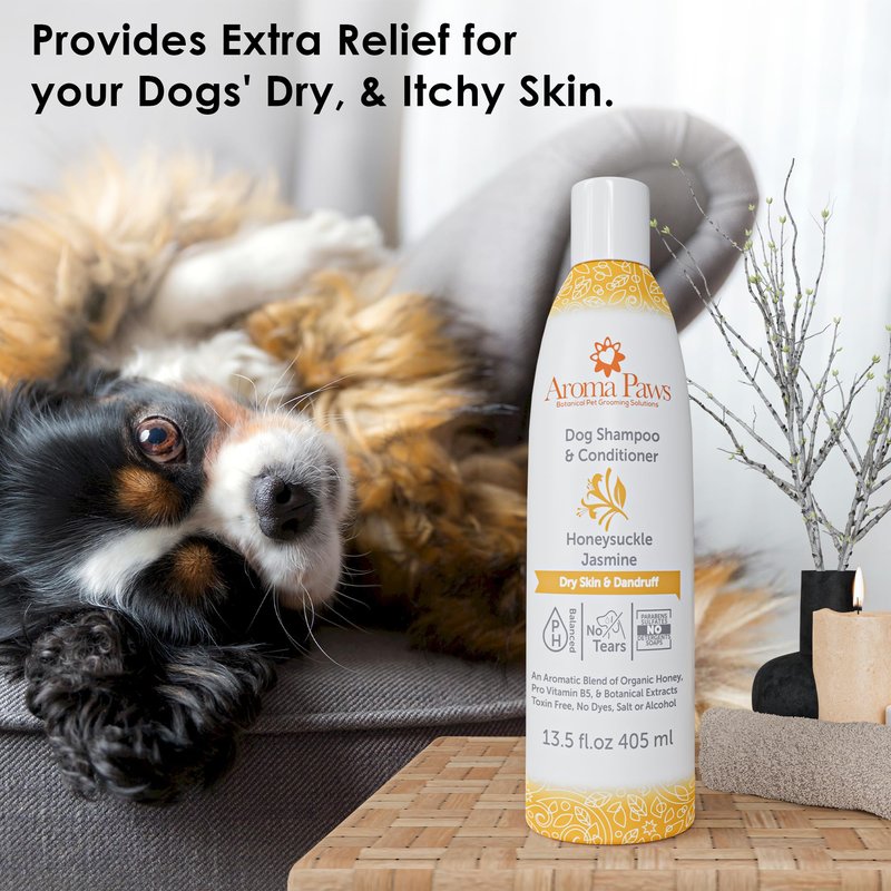 Dry Skin & Dandruff Relief Formula Dog Shampoo & Conditioner in One Provides Extra Relief for Dry Itchy Skin Cleans and lathers well using safe & healthy ingredients. Sweet Honeysuckle, sharp Indian Jasmine and subtle Sweet Violet oils blend for a rich and explosive fragrance. Our most popular blend. An Aromatic Blend of Organic Honey, Pro Vitamin B5 & Botanical Extracts Aroma Paws Dog Shampoo & Conditioner is blended with Green Tea Leaf Extract for a shiny coat, Organic Aloe Vera Extract to soothe skin and Sweet Almond and Organic Coconut Oils to relieve dryness