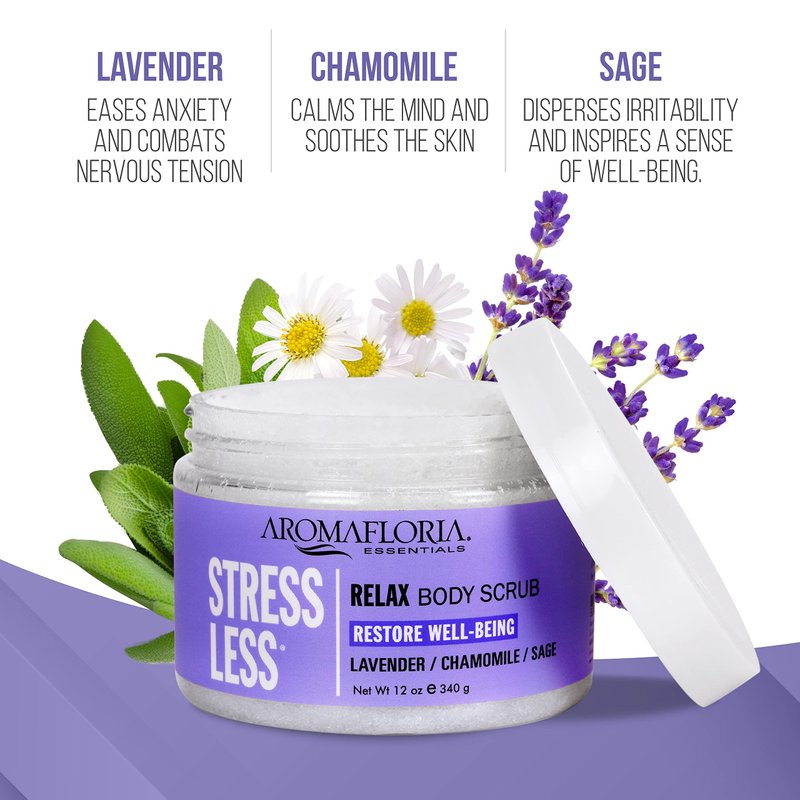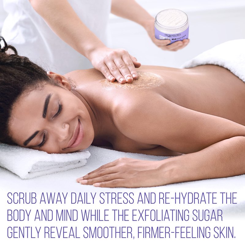 - VERSATILE: Great for anyone, our Aromafloria Aromatherapy Agitation Less Relax Body Scrub restores a sense of well-being to ease dry and flaky skin. Exfoliation with our sugar scrub reveals moist, shiny skin hidden underneath. Exfoliation also helps prevent ingrown hairs, allows moisturizer to penetrate more easily, and gives skin a rosy glow. Our Body Scrub is just what a Agitationed body needs to relax!