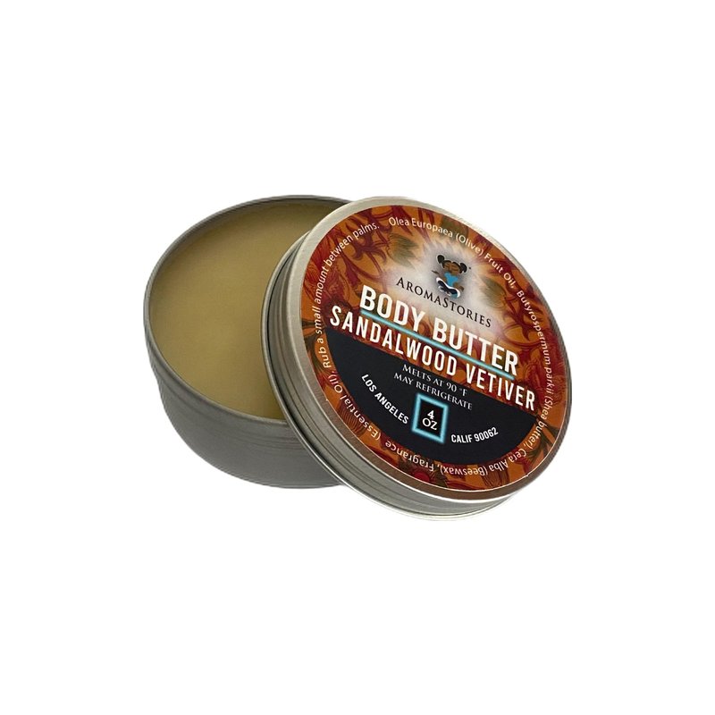 Olive oil, Shea butter and Beeswax infused with high quality essential oil moisturizes, soothes and scents the skin. The combination is a classic and traditional blend that nourishes and prevents aging of the skin. It adds shine, suppleness and luster to the skin. It's rich in beneficial nutrients and helps seal in moisture to keep skin soft. For best results, use this ultra-moisturizing formula daily. This Body Butter is silicone and paraben-free, and for use on all skin types. Explore our other body butter fragrances. Aromastories Sandalwood Vetiever Body Butter Moisturizes and Softens Skin. Olive oil, Shea butter and Beeswax combine to create an incredibly sensual and mature, highly fragrant moisturizer. With the consistency of a Soft Salve, Dense and Rich our body butter offers skin protection, preventing dryness, roughness and calluses. Capable of providing deep moisturization and long lasting softness, the Aromastories Body Butter recipe is a timeless, traditional source, for soft and supple skin. Aromastories makes you and your skin confidently cuddlable. Body Butter is free from parabens and is only tested on friends and family. Made with lots of Love! Body butter melts at 90 degrees Fahrenheit, and may be kept in the refrigerator indefinitely, but is not required. It is advised to keep unused body butter in the refrigerator.