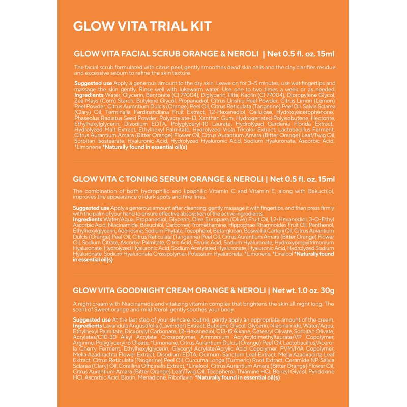 - [ Complete Skincare Set ] This Glow Vita Trial Kit is featuring our exfoliating facial scrub cleanser, vitamin C serum, and Goodnight Cream. Perfect beauty gifts for daily skin care routine.