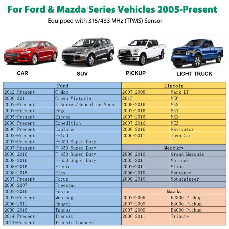 Fitment Vehicles: Customized for Ford & Mazda Series Vehicles 2005-PresentEquipped with 315/433 MHz (TPMS) Sensor
