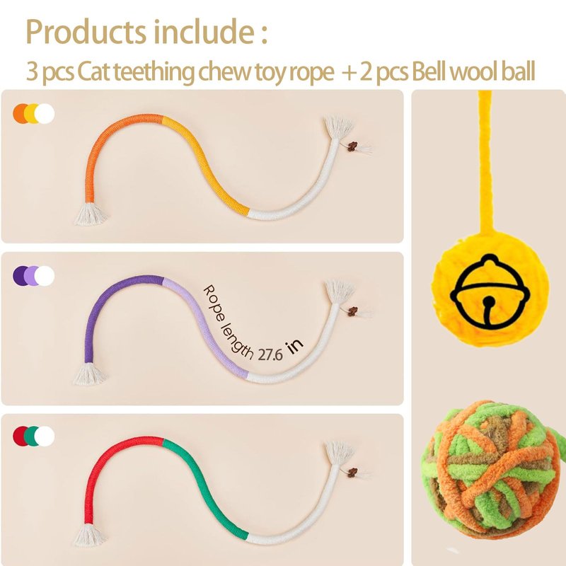 - Products include : 3 pcs Cat teething chew toyrope + 2PCS Colorful Yarn Cat Balls Built-in Bell