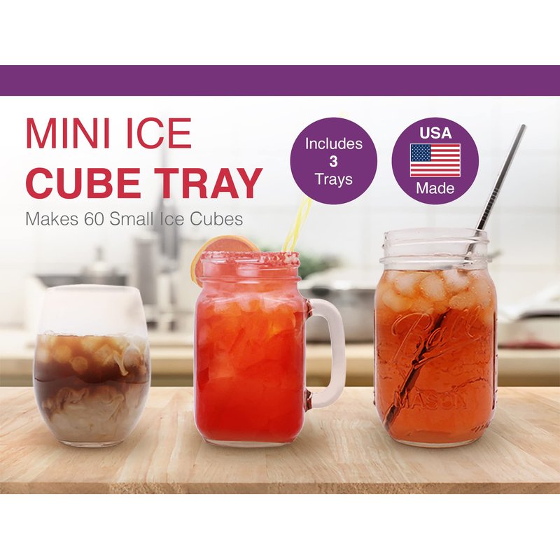 - Mini Ice Cube Tray, Set of 3 - This set of small ice cube trays create mini ice cubes that are the perfect size for sports bottles, blenders, cocktails, ice coffee or simply for chewing/sucking. Each pebble ice tray creates 60 small, round-bottom cubes. Includes 3 trays (180 cubes total).