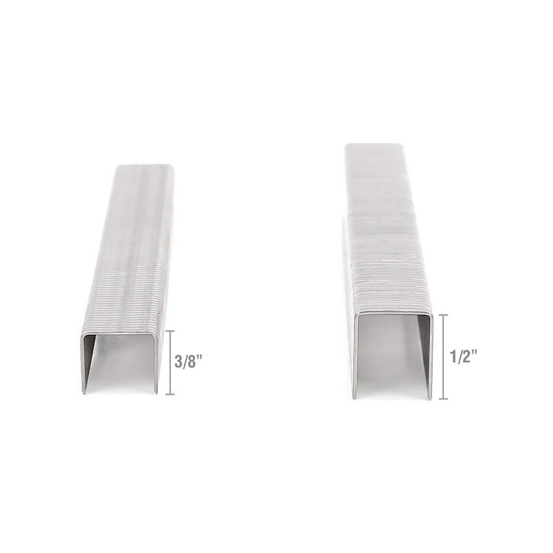 - The Arrow Fastener 3/8" T50 506SS1 stainless steel staples:3/8 in. crown size, 3/8 in. leg length, includes 1000 staples.