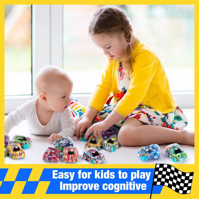 - Pull Back and Go: just pull mini cars back and then the vehicle will automatically move forward quickly; Not need to use battery, and it is easy to play; Their pull back and go mechanism lets junior racers enjoy non stop fun while stimulating their sensory motor skills and improving their hand eye coordination