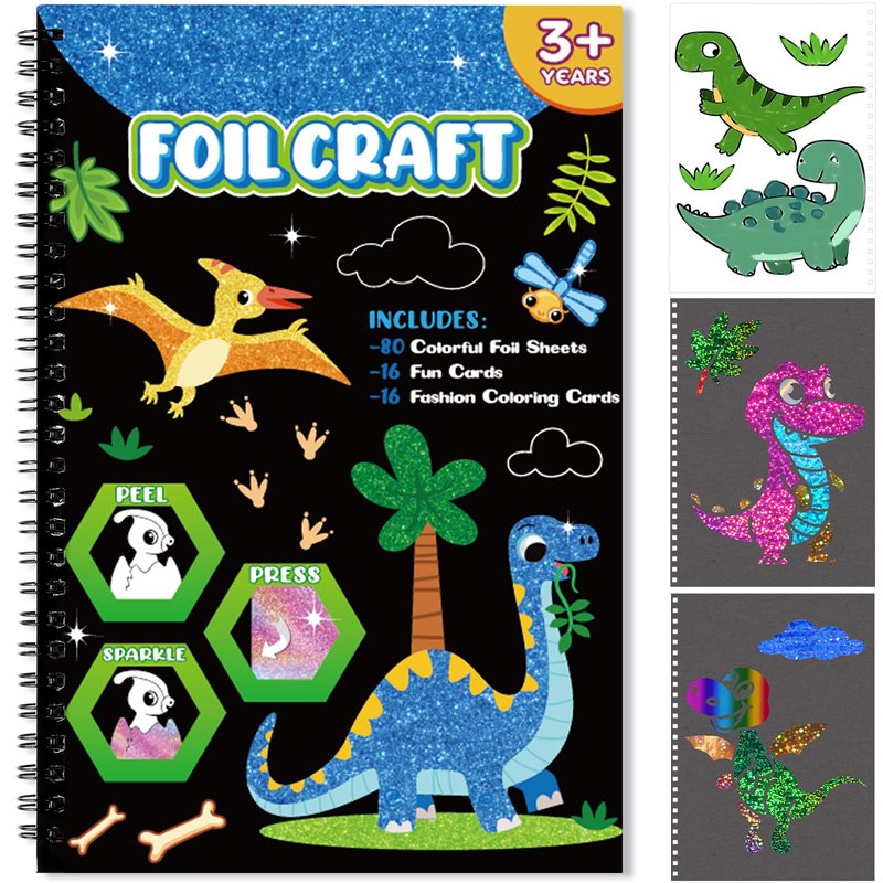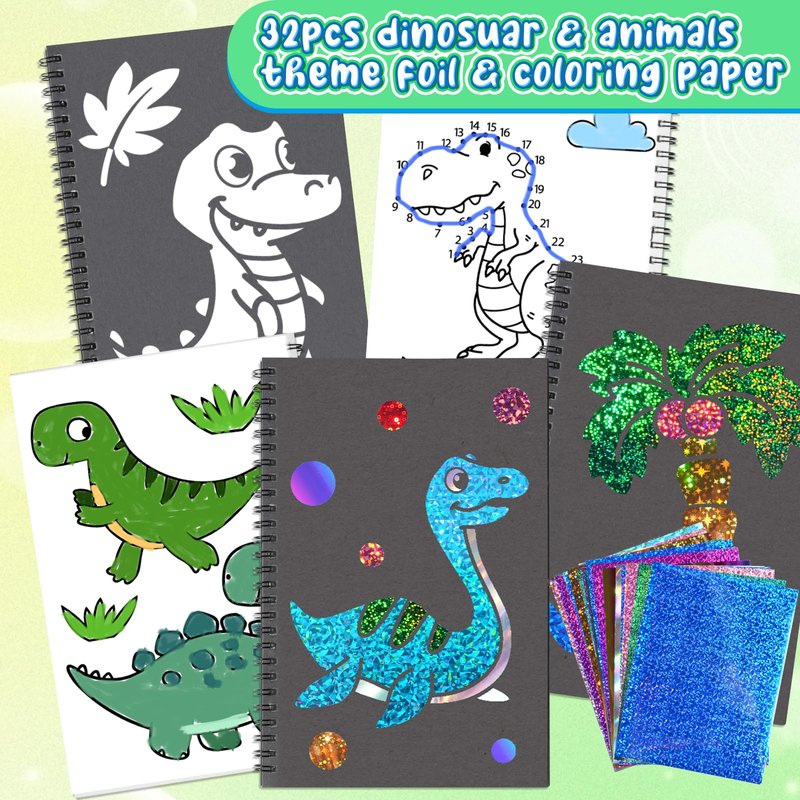 - Easy to Use: this dinosaur themed art craft is foil & coloring paper 2 in 1,peel off a single white section of the the top sheet,then place a piece of foil on the sticky area.Make sure the shiny side of your foil is facing up,them firmly press down on it with the wooden pens.Lift the foil away to reveal awesome rainbow sparkles.One the other back page is a drawing color cards with spot different,dot to dot games.