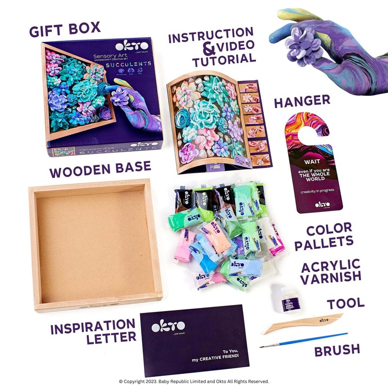 - Find time for relaxation with Okto Art Kit: Immerse yourself in the sculpting process and be inspired by the gentle serenity of pink, the mystery of purple, the turquoise color of sea waves, cool blue - the color of the sky, space, air and freedom, the balance and purity of white. The pastel colors of modeling clays in our succulent craft box suggest naive fantasies and dreams. Okto craft set Tenderness immerses in thinking and promotes a creative atmosphere.
