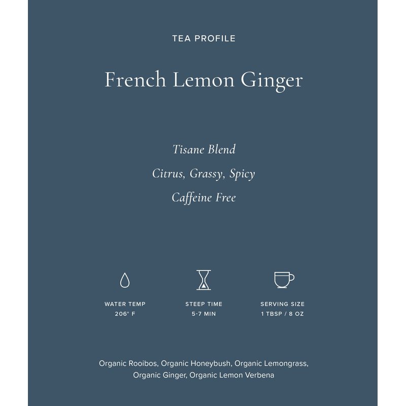 - ADDITIVE FREE - All of Art of Tea’s blends are 100% organic or made of natural ingredients with no additives. This Organic French Lemon Ginger Tisane tea includes: Organic Rooibos, Organic Honeybush, Organic Lemongrass, Organic Ginger, Organic Lemon Verbena.