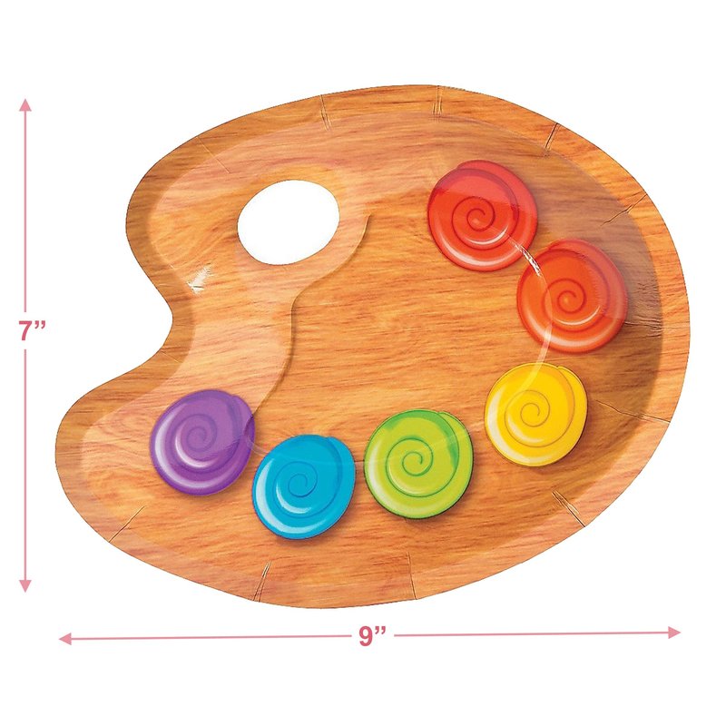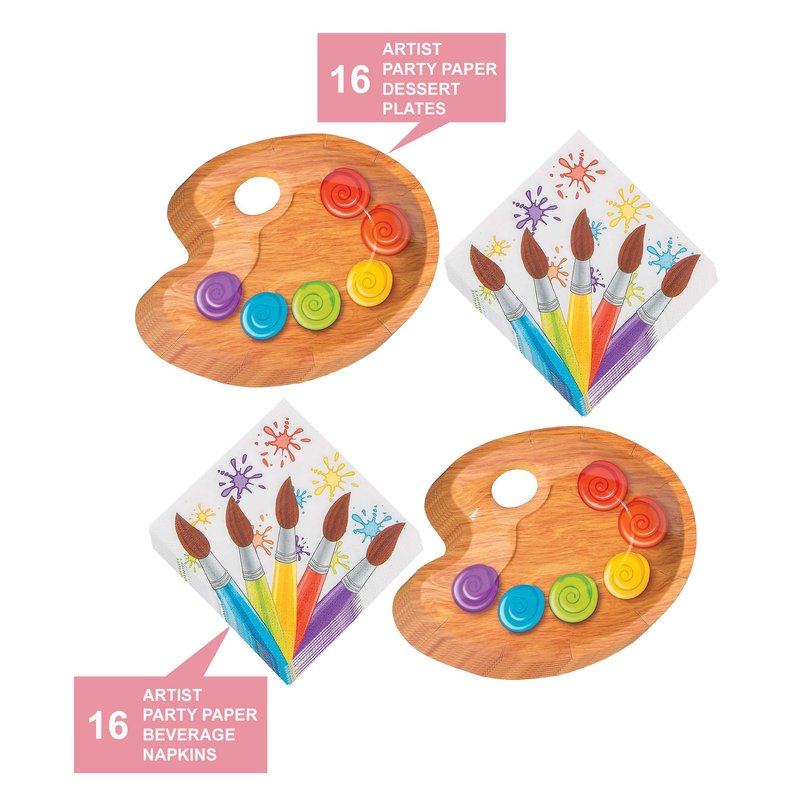 - Plates feature paint samples on a wood-looking palette tray, complete with thumb hole for carrying. Napkins feature a colorful variety of paint brushes.