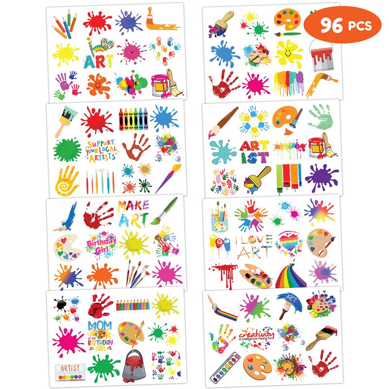 Art Temporary Tattoo Birthday Party Decorations Favors 8 Sheets (96PCS) Tattoos Stickers Cute Party Supplies Kids Girls Boys Gifts Classroom School Prizes Themed