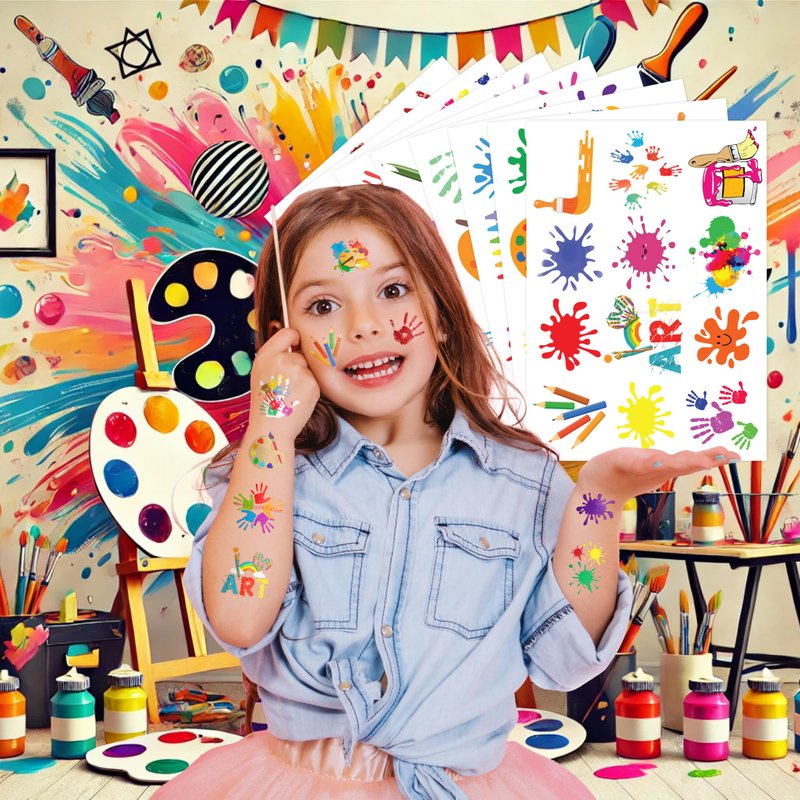 - đăGREAT GIFT IDEAS FOR ART PARTYă: Temporary tattoo Art stickers feature multiple Art tools with the appearance of colored pencils, watercolor palette and brush, etc .Paint or Art birthday theme is the leading priority in chasing childrenâs dream to become artist. This kind of temporary tattoo is willing to take people to a colorful world covered by paint and magic. During the moments of party, children have no boredom at all replaced with cheer plus excitement when they play with our tattoos