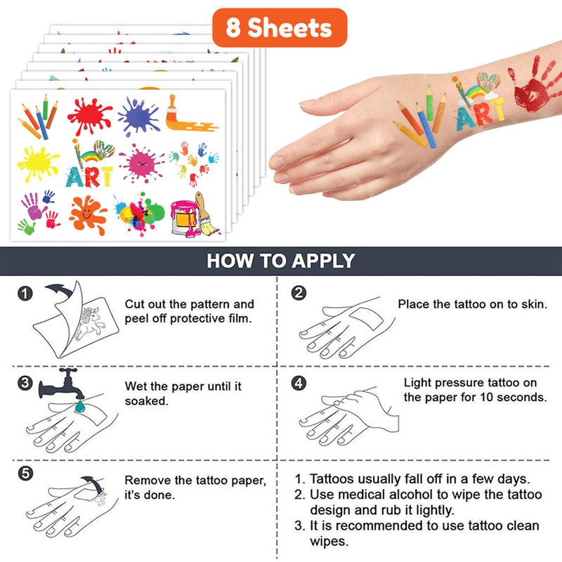 - đ¨ăPERFECT TATTOOS FOR THEMED ART PARTY DECORATIONSă: Art tattoos pertaining to our popular collection will accommodate childrenâs expectations that they always look forward to having them at Birthday parties, Christmas, and special celebrations. Each tattoos set covers 8 sheets in total with 96 Pcs. The size of each tattoo sticker is 6.1*3.1 inches, one size fit for adults to kids. The numerous formed art tattoo designed to different styles promising to develop the cute beauty for parties