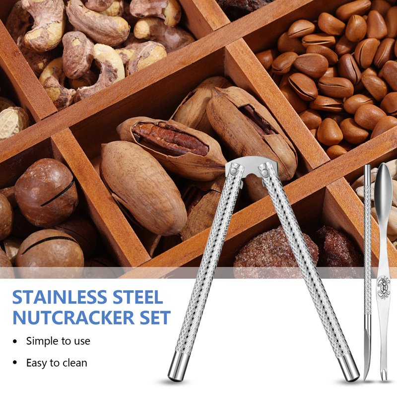 - This stainless steel set includes 2x nut cracker, 4x picks, 1x wide crab fork and 1x storage bag.