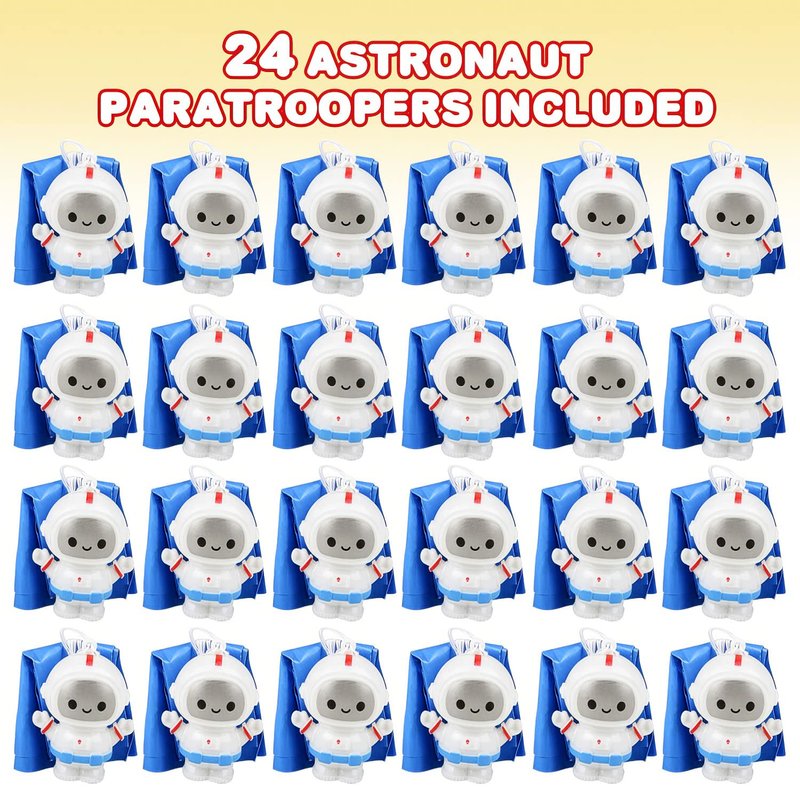 - PACK OF 24: Make those little lovers of action smile while getting the best bang for your buck! This paratrooper toys set comes with a grand total of 24 mini astronauts with parachutes. Throw them into the air and watch the toy men gently float to the ground.