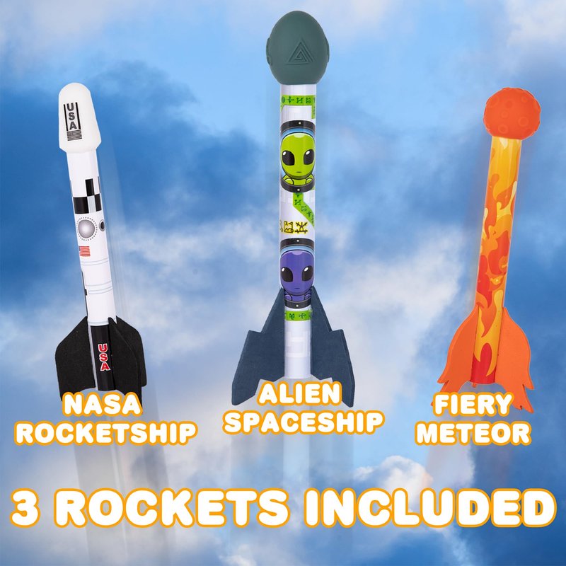 - KID-FUELED FUN: Outdoor toys for kids that take the fun to dizzying heights! This rocket launcher set comes with 3 (8.5”) foam rockets, a base with a polyester cover, and soft plastic pad to launch the rockets.